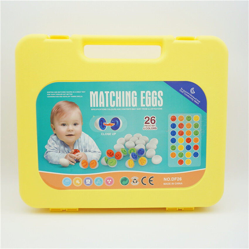 Eggs-ellent Toy: An instant hit and amazing improvement of matching eggs! 26 white eggs that opened to colorful interiors with embossed 26 uppercase letters. Inside 5 true colors are red, blue, yellow, orange, green. Match the alphabet by the interior color and letters’ shape of the "yolk" and then works at connecting the pieces together. The carton measures 11.6x9.8x2.8in, weigh 25.5oz.