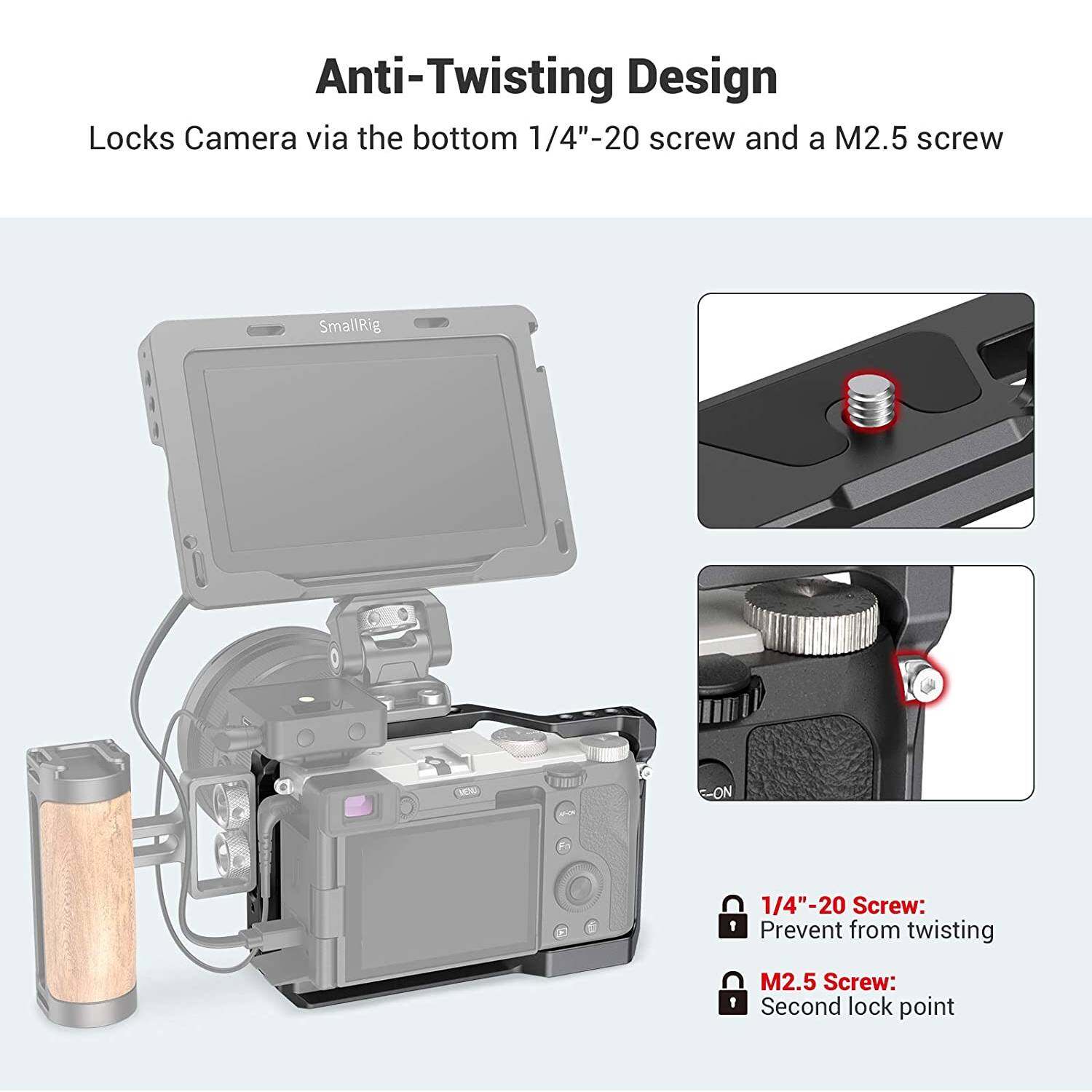 SmallRig Cage for Sony A7C 3081 is a form-fitting full cage specifically designed for Sony A7C. It is lightweight and compact. To maximize the mounting options, the cage can be seamlessly integrated to the camera and features multiple 1/4”-16, 3/8”-20, ARRI thresholds, and cold shoe, which enable filmmakers to set the whole rig up within the compact body of the cage. With a built-in Arca-Swiss quick release system, the cage allows the fast switch between tripod shooting, handheld shooting, and gimbal shooting. The cage secures the camera via a 1/4”-20 screw on the bottom and an m2.5 screw on the right side to further prevent twisting. Additionally, the lightweight and ergonomic design are able to boost the grip experience to the greatest extend.