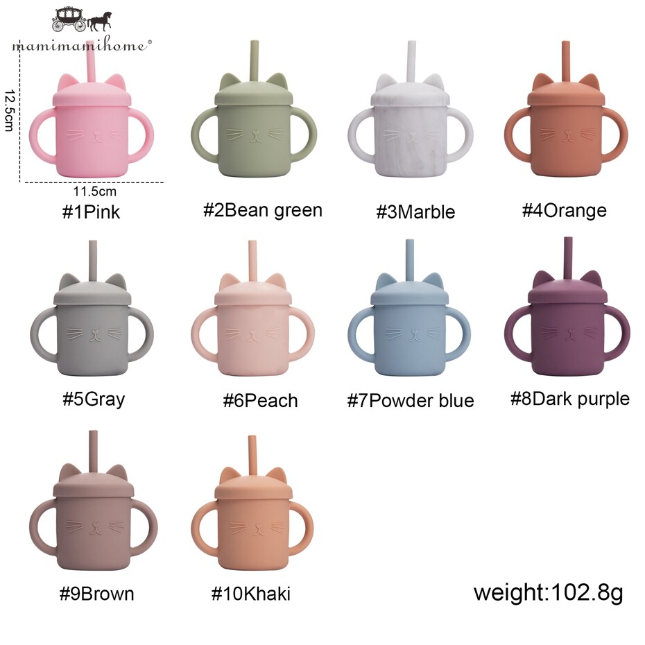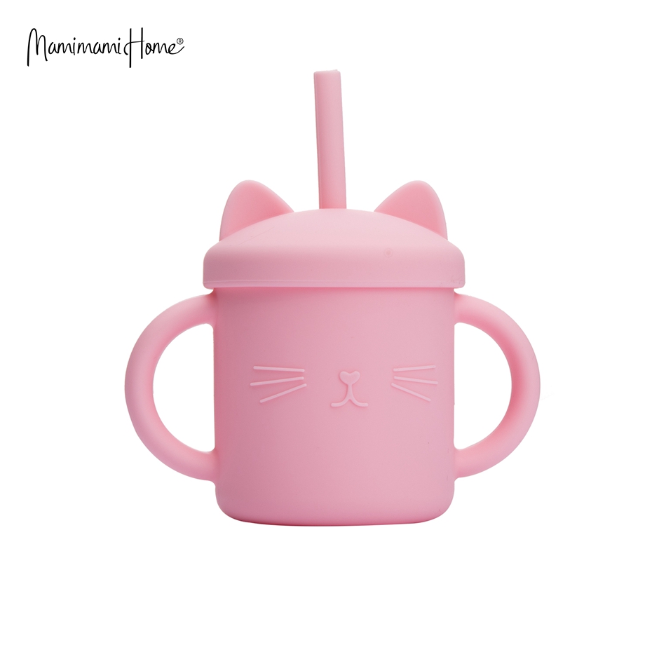 Mamimami Home Kids Sippy Cup 1PC 100% Food Grade Silicone Cups with Straw & Cover Cartoon Cat Baby Self-feeding Essentials