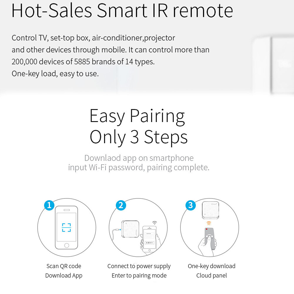 Say goodbye to use remote controls for each of the IR home appliances such as TV, Air-Conditioner , TV box, light, Fan, Audio, etc. You can remotely control these devices with the tap of your finger on the mobile App, Also you can real-time monitor the temperature and humidity on App at anytime and anywhere. Please kindly read the user manual carefully before usage and keep it for future reference.