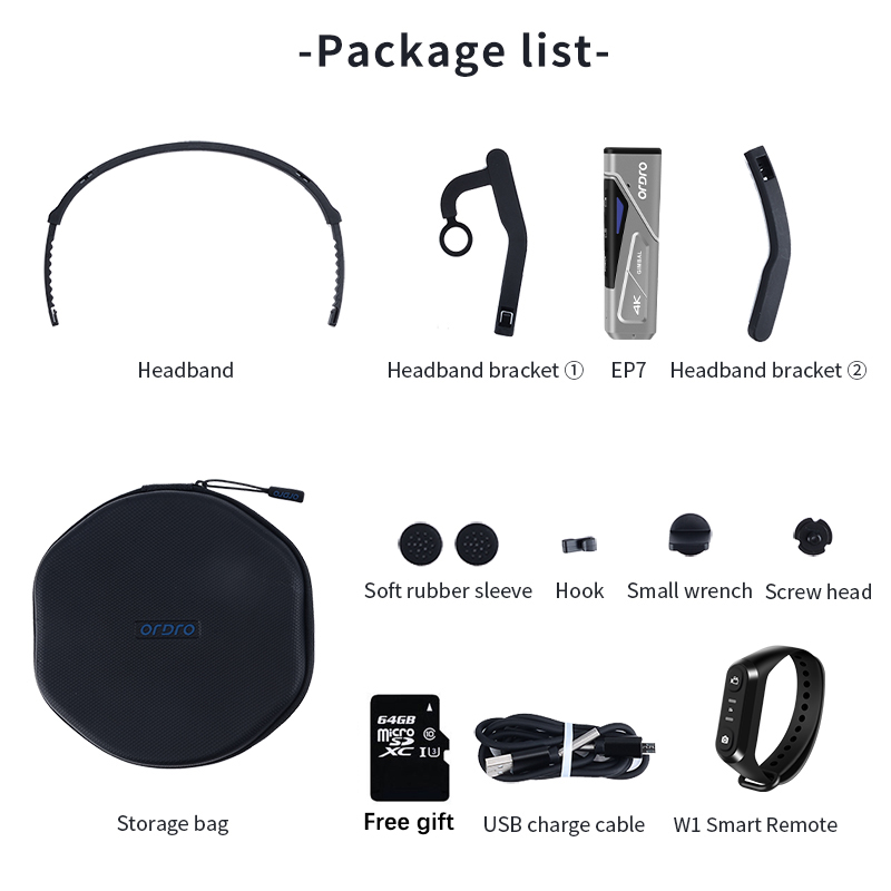 Package Included ? 1 x EP7 FPV camera ? 1 x W1 Wrist remote control ? 1 x 64G Micro SD XC Card ? 1 x USB Cable ? 1 x Carrying Case ? 1 x User Manual ? 1 x Headband ? 1 x Small wrench ? 1 xScrew head ? 1 xSoft rubber sleeve ? 1 x Hook ? 1 x Storage bag