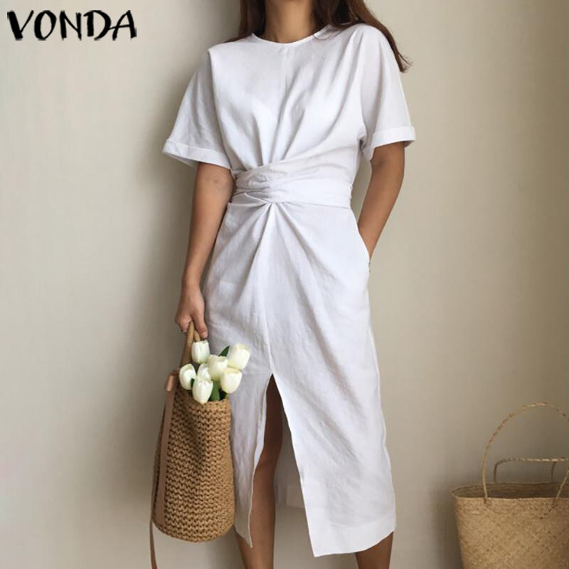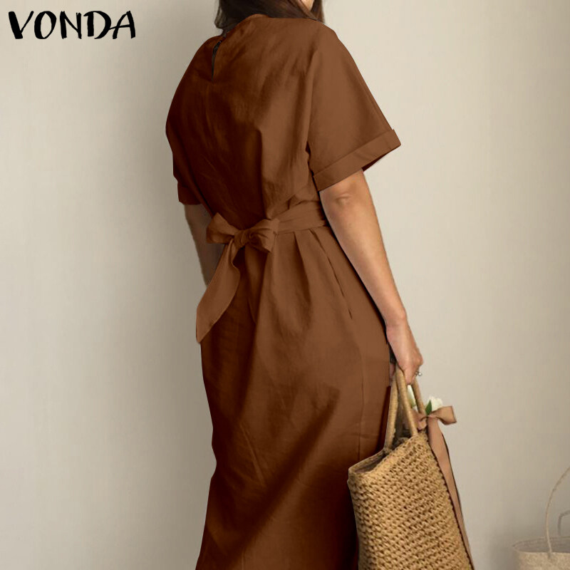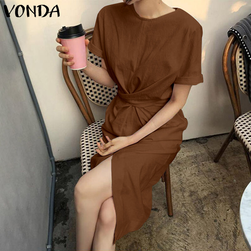 VONDA Women Summer Oversized Short Sleeve Casual Sundress Shirt Slit Dress (Korean Causal)