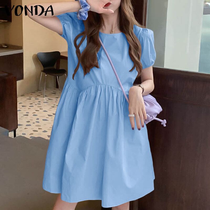 (Korean Causal) VONDA Womens Puff Sleeve Shirt Dress Holiday Casual Sundress Retro Solid Long Tops