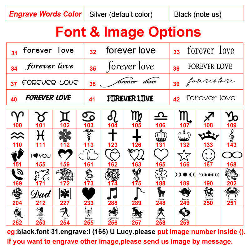 2) Please leave message or note to us engraving information : front (default) or inner, 1-2 Image or 15 characters limited.