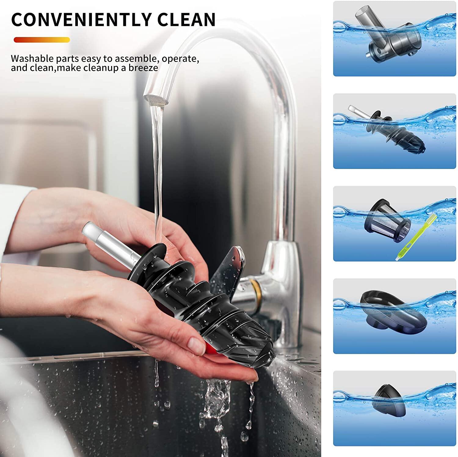 Ideal juicer attachment: With our chewing juicer attachment you can upgrade your mixer to a juice machine. It helps you separate the pomace from the juice easily and extracts the nutrients from the fruits and vegetables into the juice. Enjoy a nutritious and healthy life.Maximum juice volume: Thanks to the 7-segment spiral screw and high-density 304 stainless steel filter, the fruit juice yield can reach 90%. No manual filtering of the pomace and no adding of water as with other juicers. You can enjoy the original taste and aroma.Easy to use: installation and removal can be completed in minutes. Just loosen the attachment button and insert the worm shaft into the hub bushing, then place the cut fruits and vegetables in the feed tube, the blender does all the work.Easy to clean: Wash directly with water, with the equipped brush you can achieve quick cleaning in a few minutes. Please do not put in the dishwasher. This slow juicer accessory is suitable for all Kitchen Aid juicers.