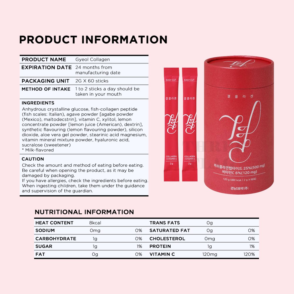 SURPRISE FREE GIFT Free Gifts + sooni stickerHello! I'm sooni 100% Authentic Products! If it's fake, I promise you a 500% reward!! All Products are Ready to Ship With in 24 Hours✈ Direct Shipping From Korea HQ & Fast Shipping Service Free Samples for All Purchase❤ Follow 'sooni_shop' to get more vouchersReady stockManufactured in Korea, it contains 500mg of Collagen plus 120mg of Vitamin C which is the perfect combination for better absorption of the benefits of collagen. HOW DO I TAKE IT? It's very easy! Take one sachet at a time, put the powder directly in the mouth or mix with 100ml water. You can take it 1-2 times a day.Description- Lemona Gyeol Collagen 2g (1 powder stick)- 1 stick = Collagen 500mg + Vitamin C 120mg- Lemon Taste- marine collagen- Powder type- Eat as is or dissolve in water. ShippingAll products will be delivered from Korea directly.We will send your lovely products asap.Generally, It will be taken 7~10 business days for delivery to your home. Customer ServiceDo you have any questions?Send me a messageHave a nice shopping❤