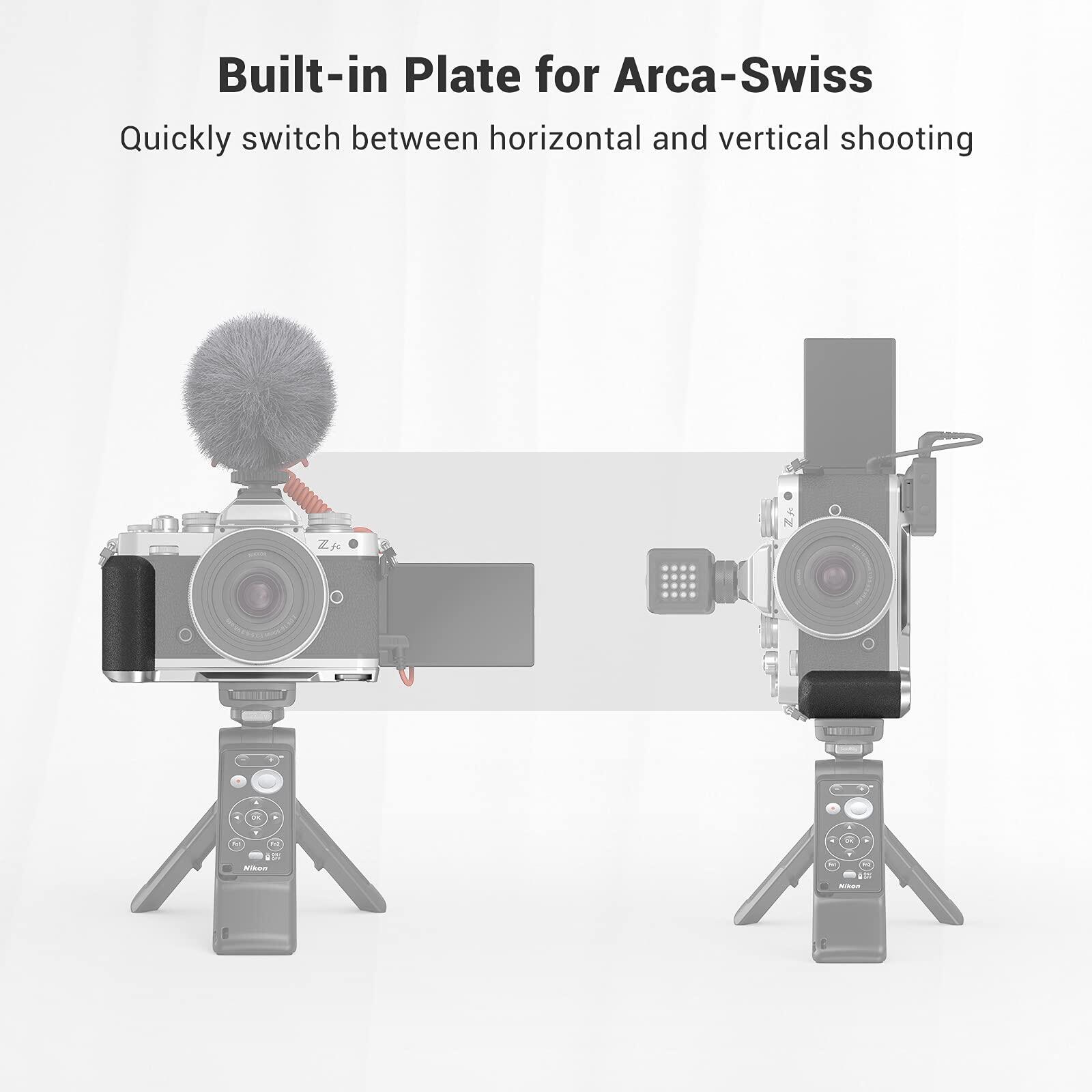 SmallRig L-Shape Grip for Nikon Z fc Camera 3480 is designed to provide a comfort grip. The retro-style grip shares similar texture and color with the camera; the baseplate shares the same silver surface treatment with the camera and fits perfectly. The L grip secures to the camera via a 1/4"-20 D-ring screw on the bottom and comes with a built-in 1/4"-20 threaded hole on the grip that enables vertical shooting on a tripod. The baseplate features a built-in Arca Swiss plate to quickly switch to tripod shooting, and a 1/4"-20 threaded hole at the center that supports tripod or Manfrotto quick release plate. In addition, the baseplate features a built-in cold shoe allows attaching microphone, light and other accessories; the plate also comes with a slot for wrist strap. The grip adopts compact and lightweight design, which is easy to carry around.