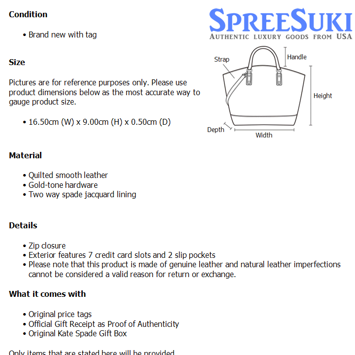 All our products are 100% authentic and purchased from Kate Spade stores in USA. We are a reputable registered business in Singapore and it is illegal to sell counterfeit goods in Singapore. This product also comes with a gift receipt which is printed by the Kate Spade store that we purchased the item from. It states the item that we purchased and the Kate Spade store that it was purchased from, proving the authenticity of the item. Buy with confidence.