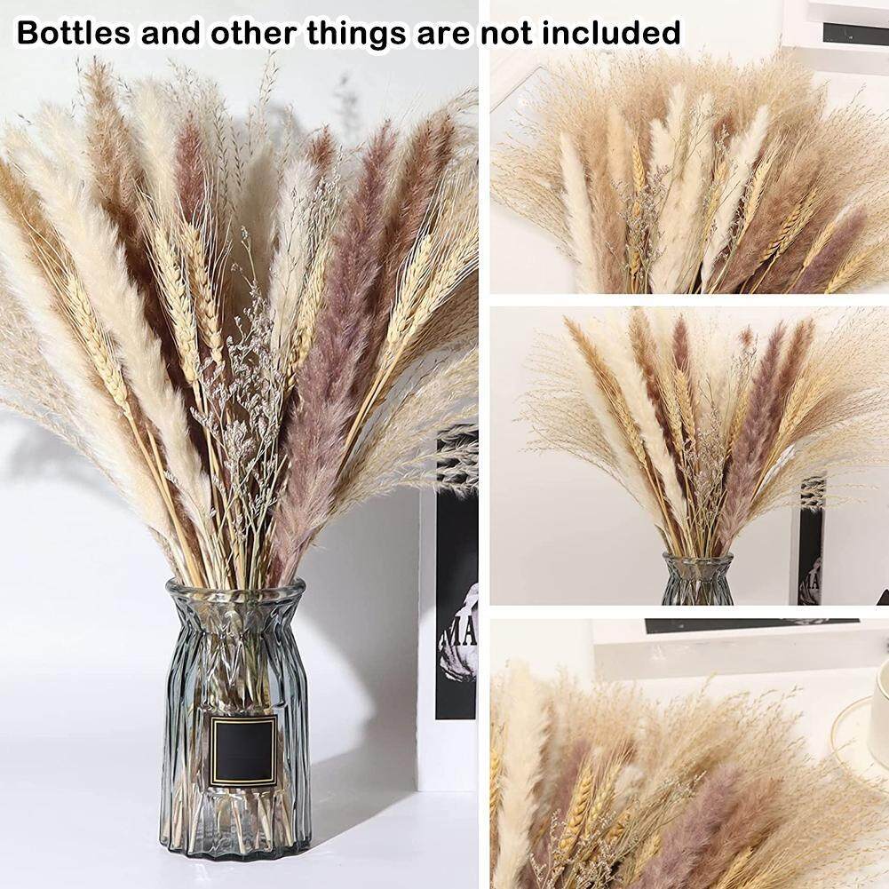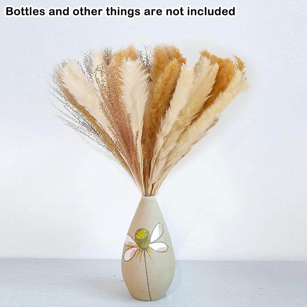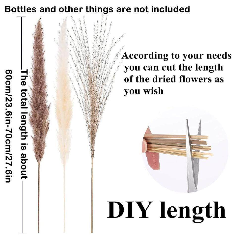 1.Package contains: A selection of 60 Pcs pampas grass, including 15Pcs white pampas reeds, 30Pcs pampas reeds, and 15Pcs Primary color pampas reeds.