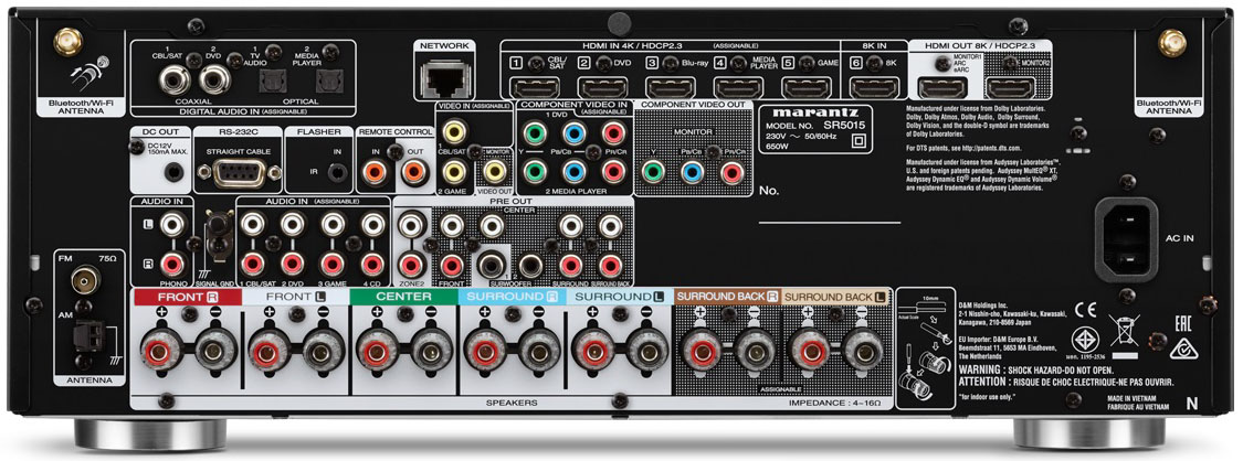 The new Marantz SR5015 includes 6 HDMI inputs and 2 outputs for all your favourite sources. One dedicated 8K input supports 8K/60Hz and 4K/120Hz** pass-through capability, 4:4:4 Pure Color sub-sampling, Dolby Vision, HLG, HDR10, 21:9 video, 3D and BT.2020 pass-through. Additionally, the latest HDCP 2.3 copy protection standard is supported on all HDMI ports. Showcasing the latest HDMI technology and specifications, the new SR5015 lets you take home entertainment to the next level with HDR10+, Dynamic HDR, ALLM, VRR, QMS and QFT support. The video processor is capable of upscaling native video sources up to 8K quality. The SR5015 also features HDMI eARC support, which supports 3D audio formats like Dolby Atmos and DTS:X in masterful quality from your TV apps. Conveniently, your HDMI inputs automatically rename themselves with information provided by the source (when available).