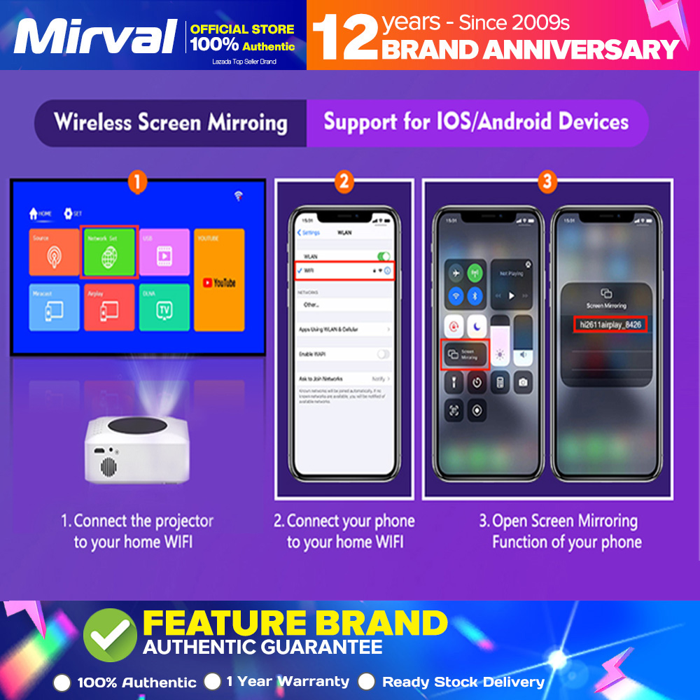 Warmly tips: 1. The smoothness of the wireless connection will be affected by the network environment. A bandwidth of 100Mbit or more is recommended when using screen mirroring with this wifi projector. 2. This is mainly for home entertainment, not recommended for class teaching. 3. Due to Netflix copyright protection, you should play Netflix from PC or TV Sticks. It can't display when connected with smartphone. 4. Not suitable for bright room use.