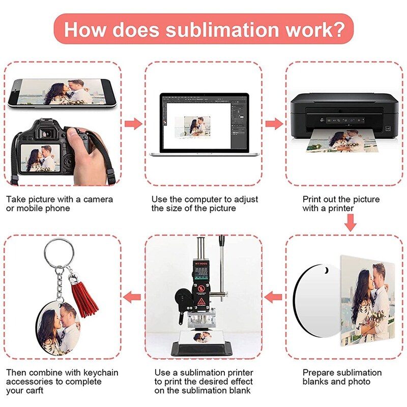 [Easy to Use] - The sublimation blank keychains have protective layer on both sides to prevent scratches, please tear off the layer before DIY, print the image at a temperature of 180 degrees Celsius (356 Fahrenheit) for 40 seconds, you can print on 2 sides, hang on the keychain with tassels, then you will get a beautiful DIY carfts.