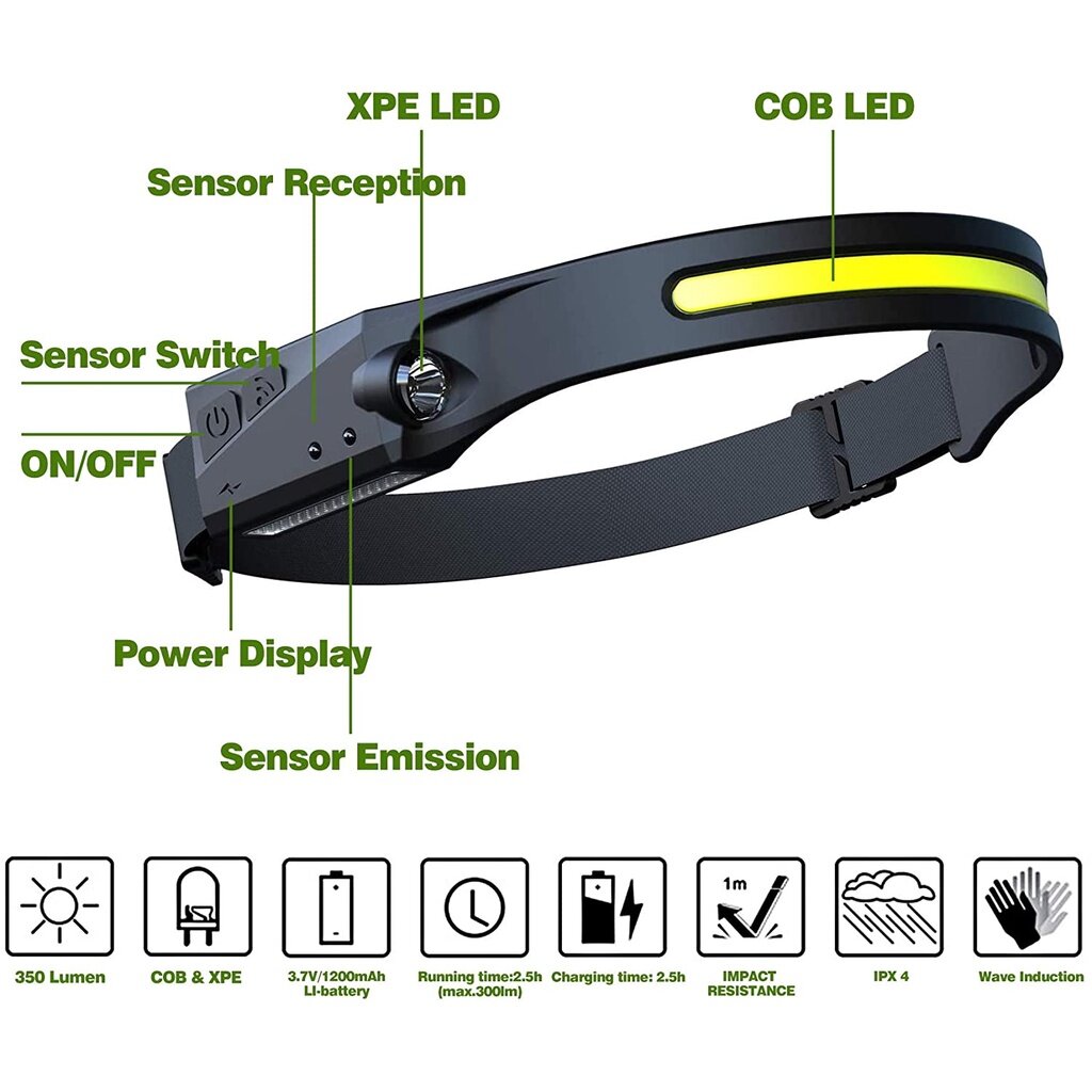 1: wave induction - with a side wave induction sensor and one touch buckle,easy to work outdoor when wearing this headlamp