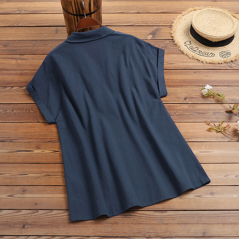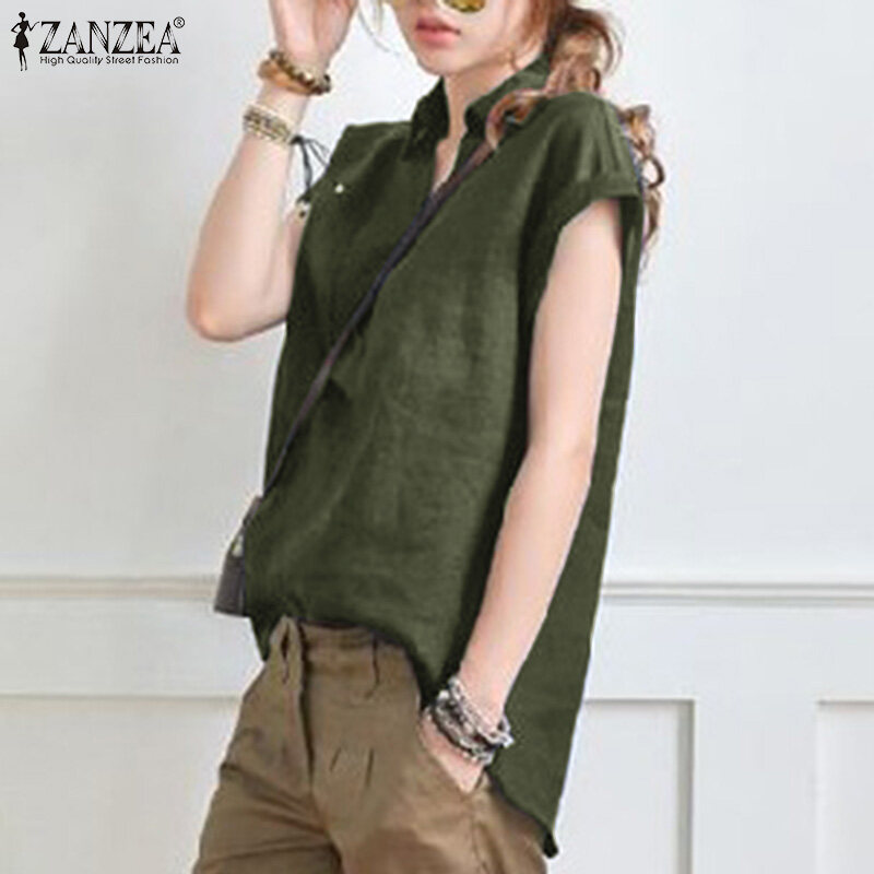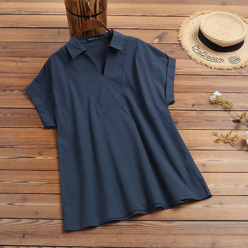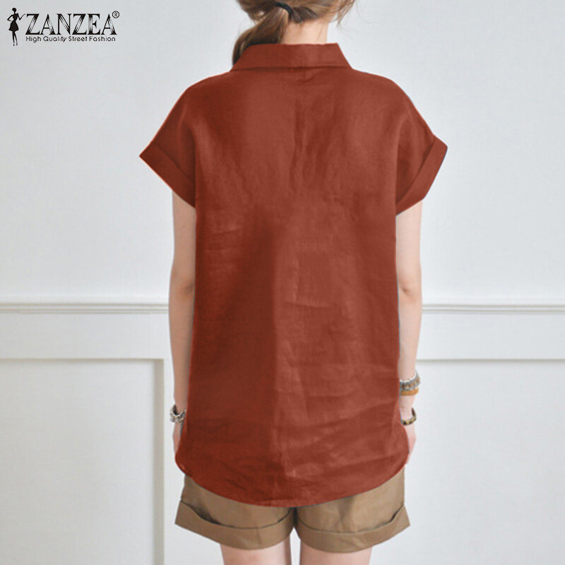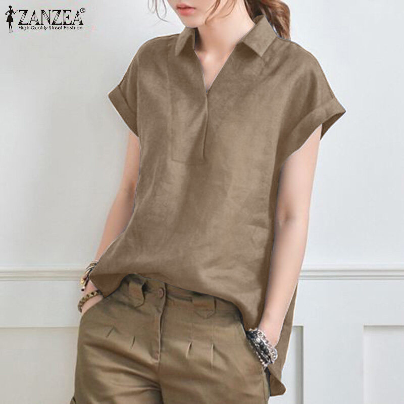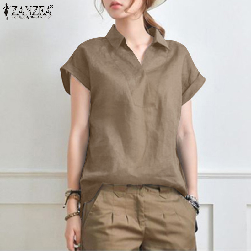 Forevercan ZANZEA Women Short Sleeve V Neck Shirts Summer Cotton Linen Casual Plain Tops Blouse