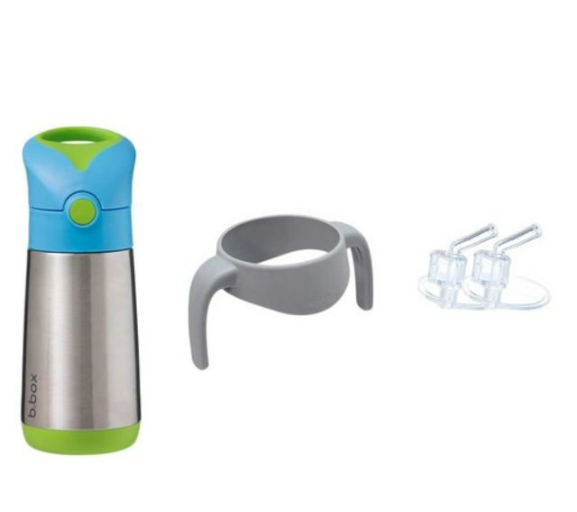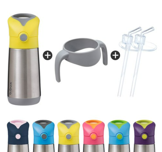 Clean modern design and big kid aesthetic. Available in six fab b.box colours. Kids love our easy drinking silicone straw top. Parents love no leaks in the bag (when the lid is closed). Replacement straw packs available, sold separately. When using to keep liquids warm - for best performance fill the stainless steel base with hot water for a few minutes to warm it before pouring water out - and filling with warm liquids.
