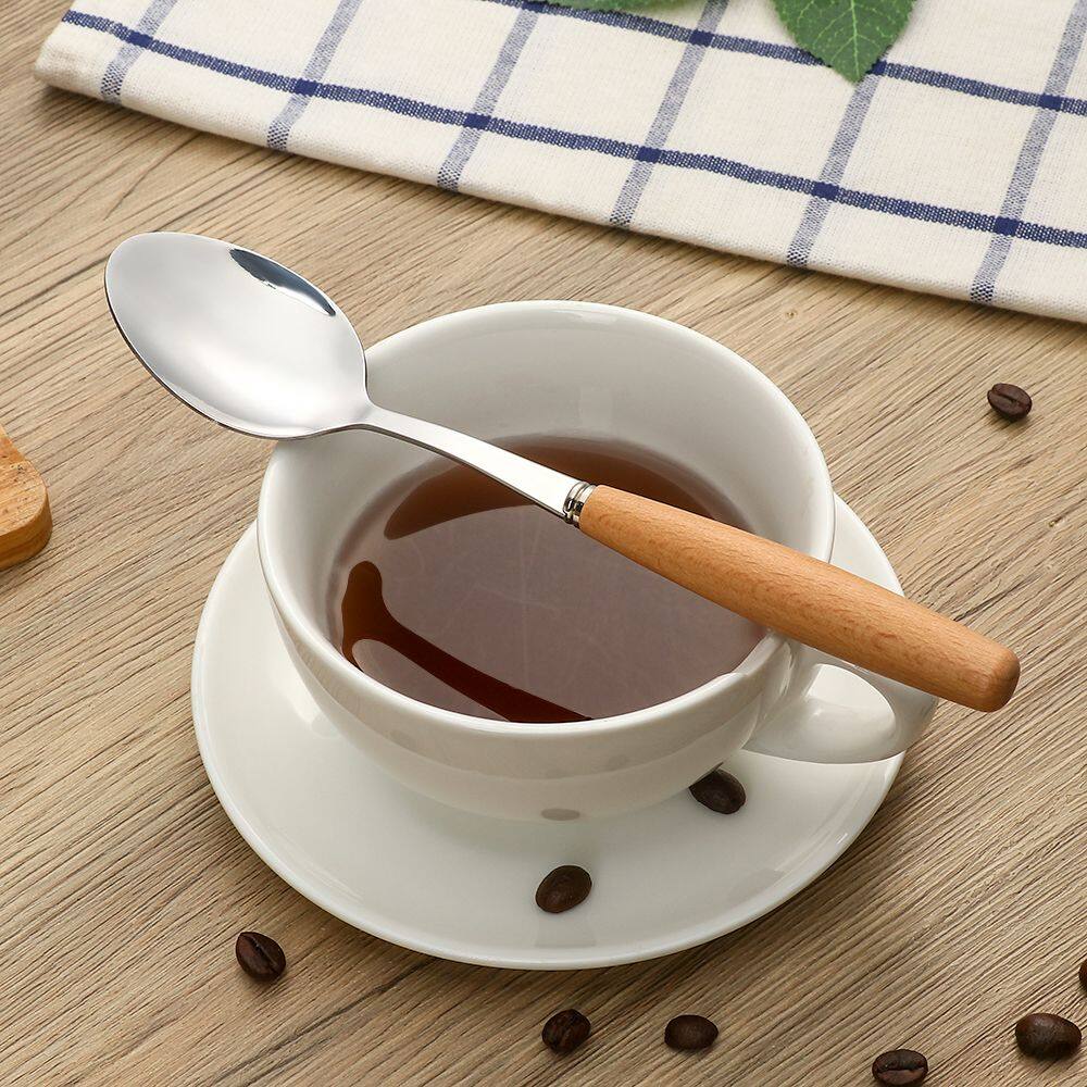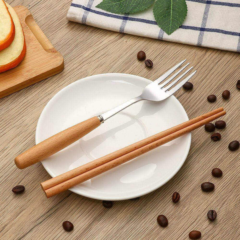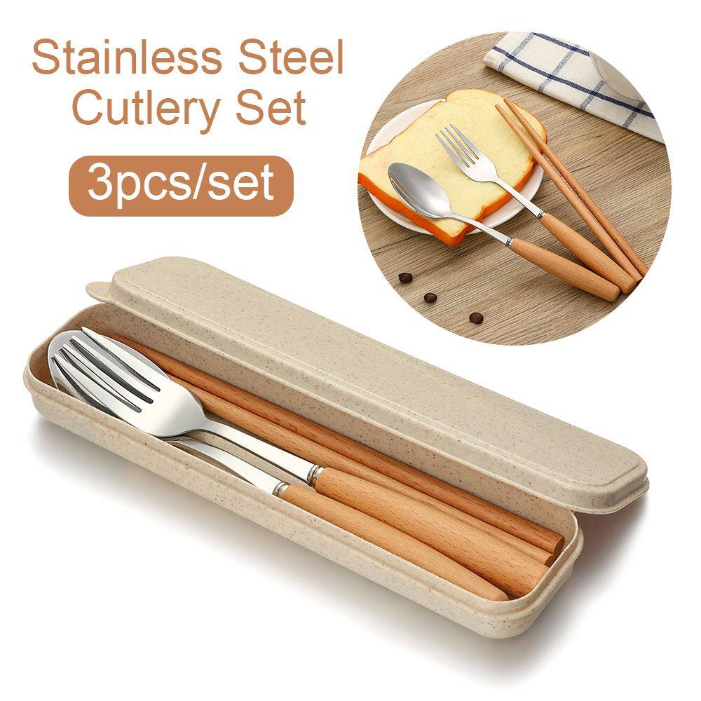 YH4F 3pcs Outdoor Travel Spoon Wooden Handle Stainless Steel Fork Utensils Tableware Flatware Set Cutlery Set