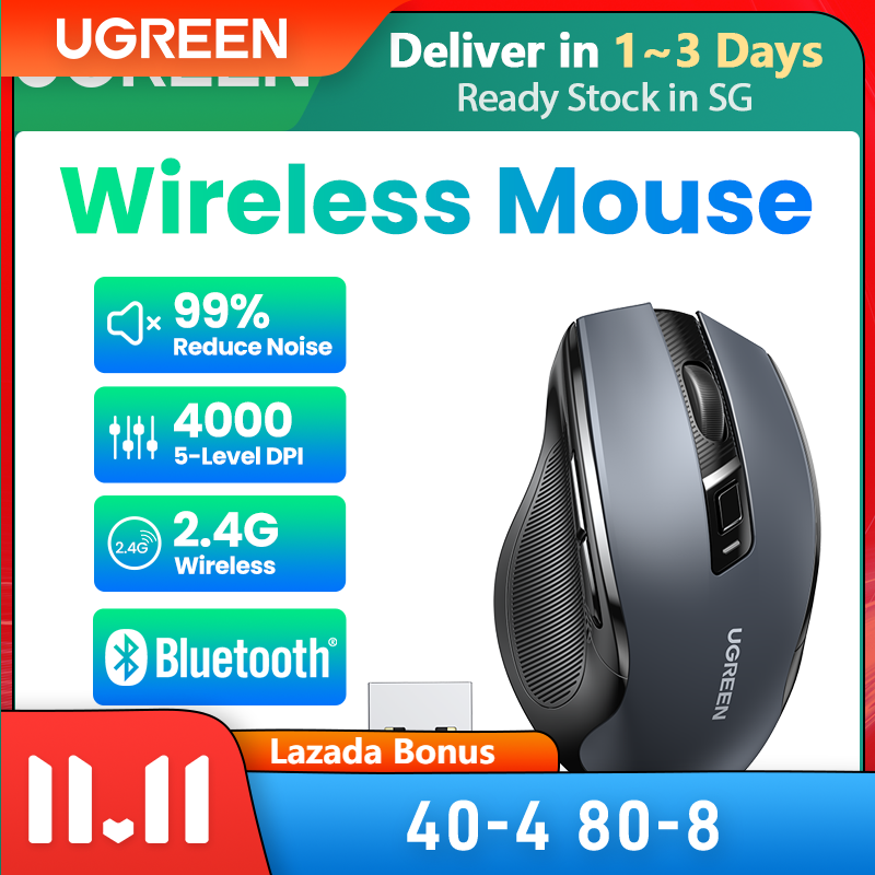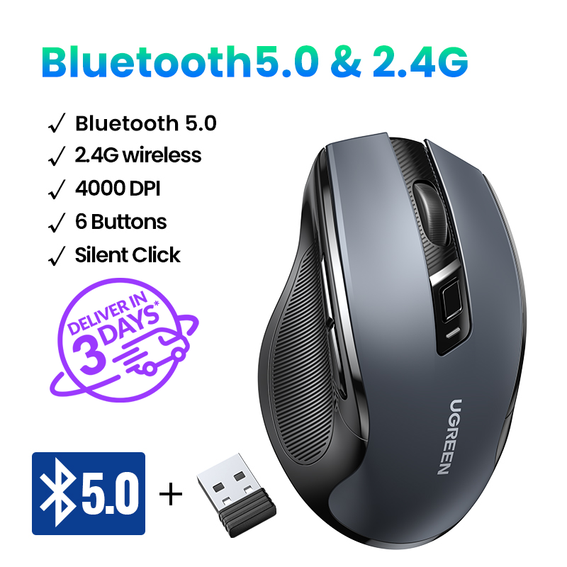 UGREEN Wireless Mouse, 6 Silent Buttons, Bluetooth 5.0 and 2.4G Wireless with USB Mini Receiver, 5 Level DPI Setting 4000DPI, Ambidextrous PC / Mac /Linux Laptop