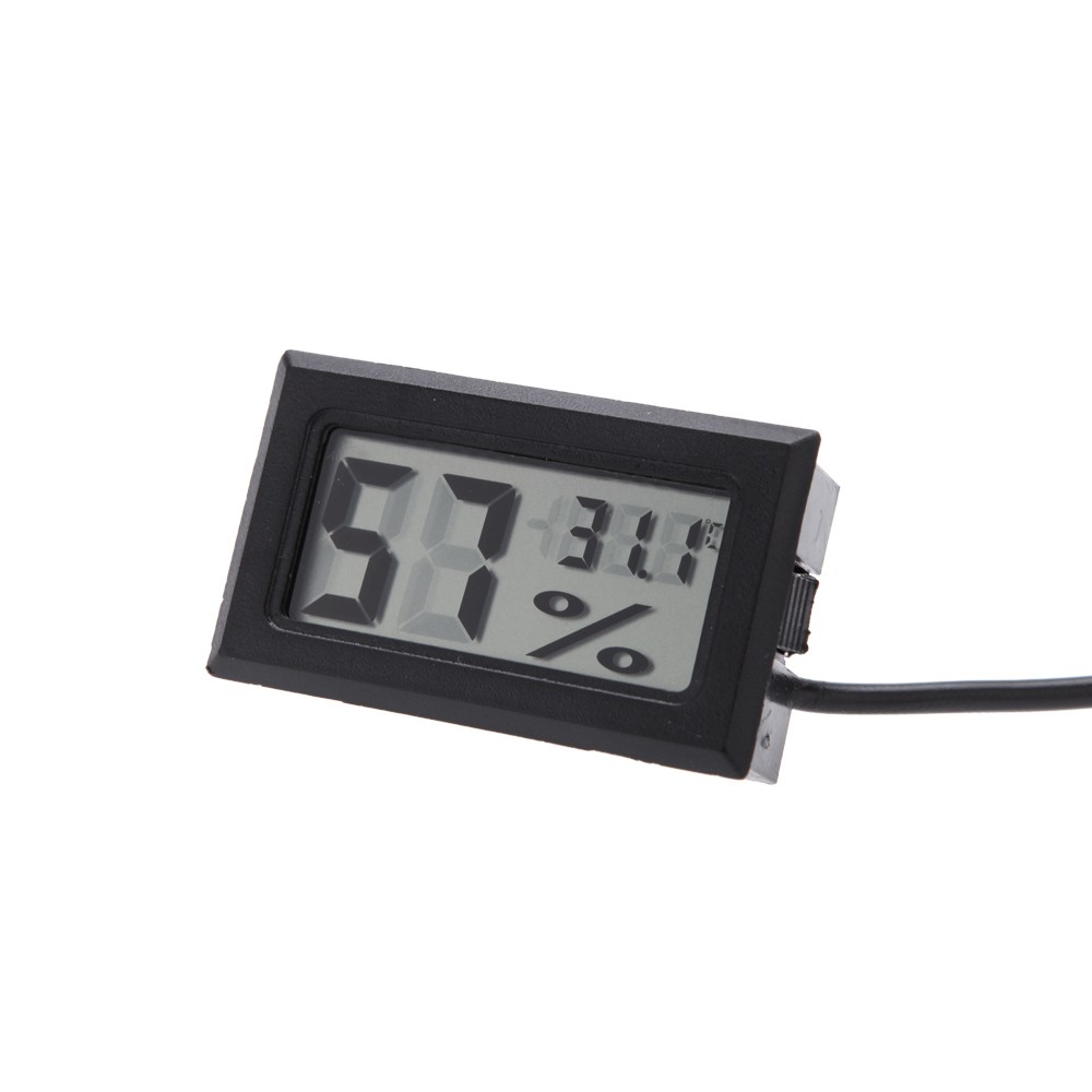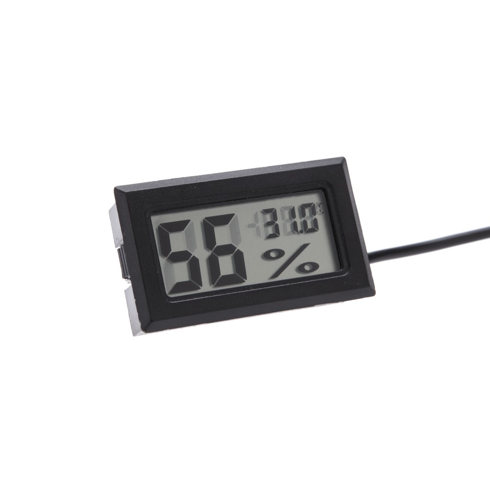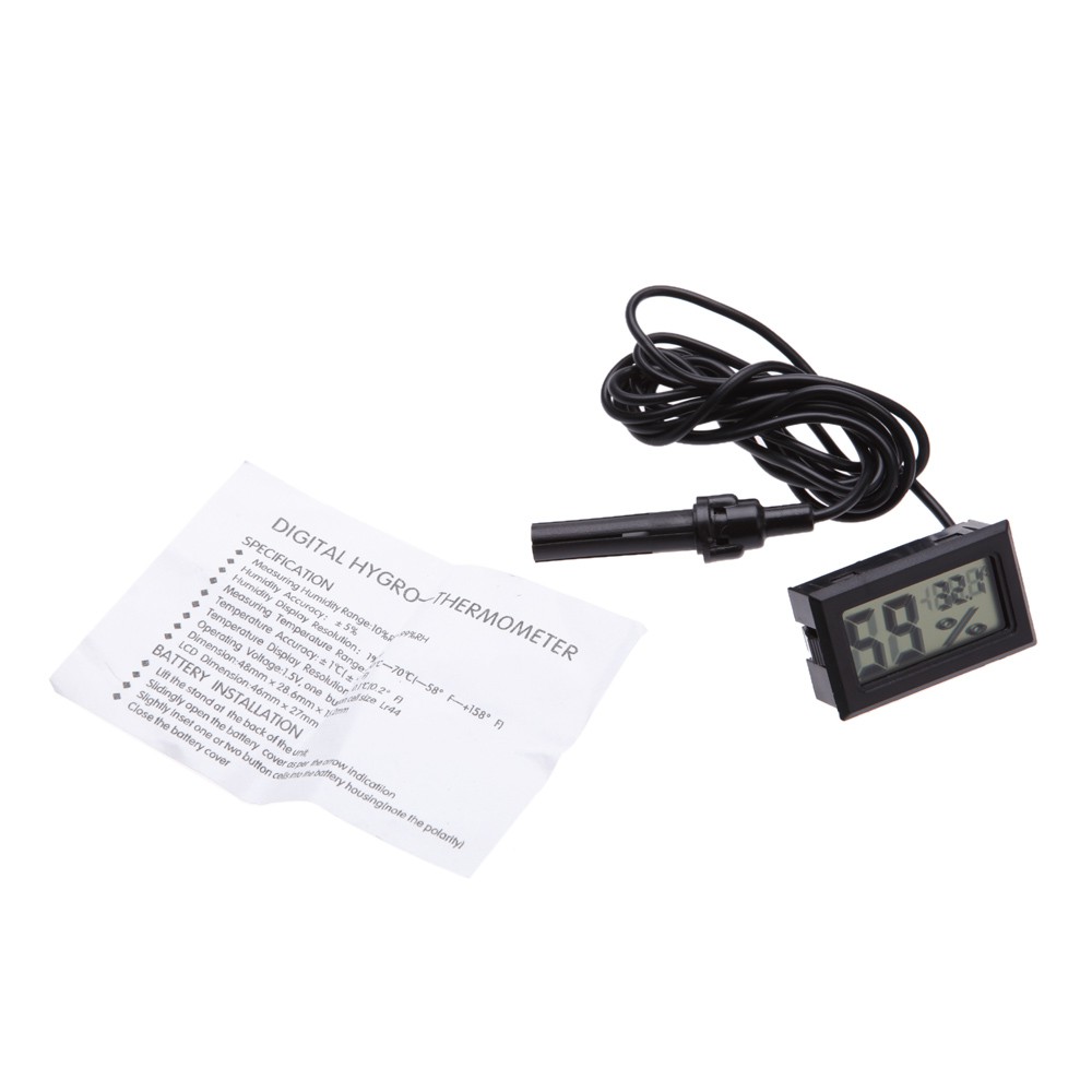 Feature: Clear and intuitive digital display of temperature and hygrometer values. Measuring temperature from -10°C to 50°C. Measuring humidity from 10% to 99%RH. Comes with a probe, which makes it easy to use. Perfect for use in incubators, brooders, rooms any other place that requires monitoring of temperature and humidity levels. Specifications: Humidity: 10%RH~99%RH Humidity accuracy: ±5%RH Humidity display resolution: 1%RH Temperature range: -10°C~50°C Temperature accuracy: ±1°C Resolution: 0.1°C Operating Voltage: 1.5V, or LR44 batteries(Not include) LCD Dimension: 36 * 16mm / 1.4 * 0.6in Probe cable length: 150cm / 59in Color: Black Dimension: 48 * 28 *15mm / 1.9 * 1.1 * 0.6in Item weight: 38g / 1.3oz Package weight: 46g / 1.62oz Package size: 9 * 6.5 * 2.3cm / 3.5 * 2.6 * 0.9in Package List: 1 * & Hygrometer (2 in 1) 1 * User Manual(English)