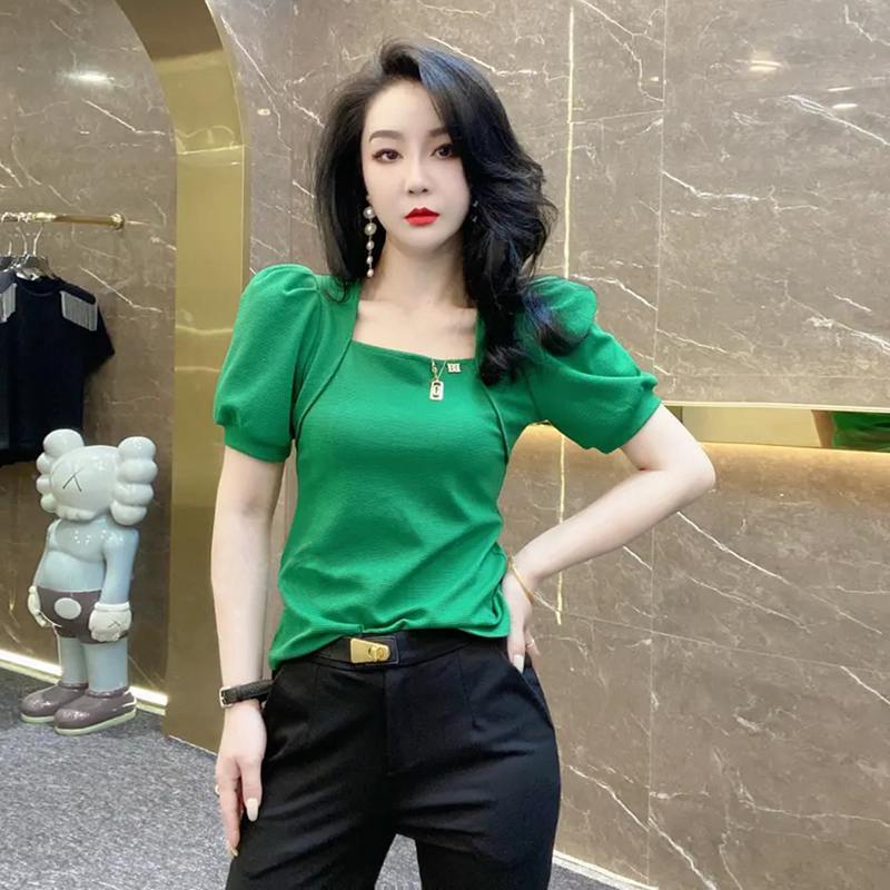 EDQRDQ Women's Puff Sleeve Square Neck Short Sleeve Elegant Slim Fit Tee Top