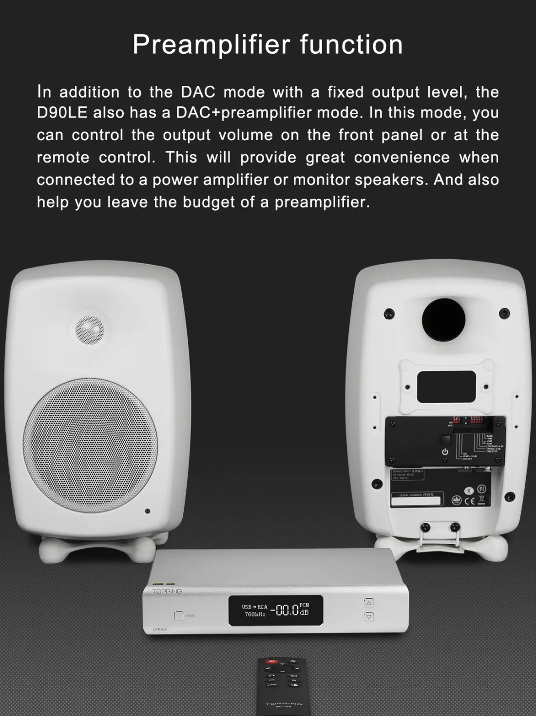 Topping D90LE supports both Pre-amp and line-out functions. If you are using it with a high-end headphone amplifier like the Topping A90 or something else, you can use the Line-out function of the D90LE. In case you want to connect it to power amps or high-end speaker chains where volume is not available on the power amp, you can adjust it using D90LE’s Pre-AMP function.