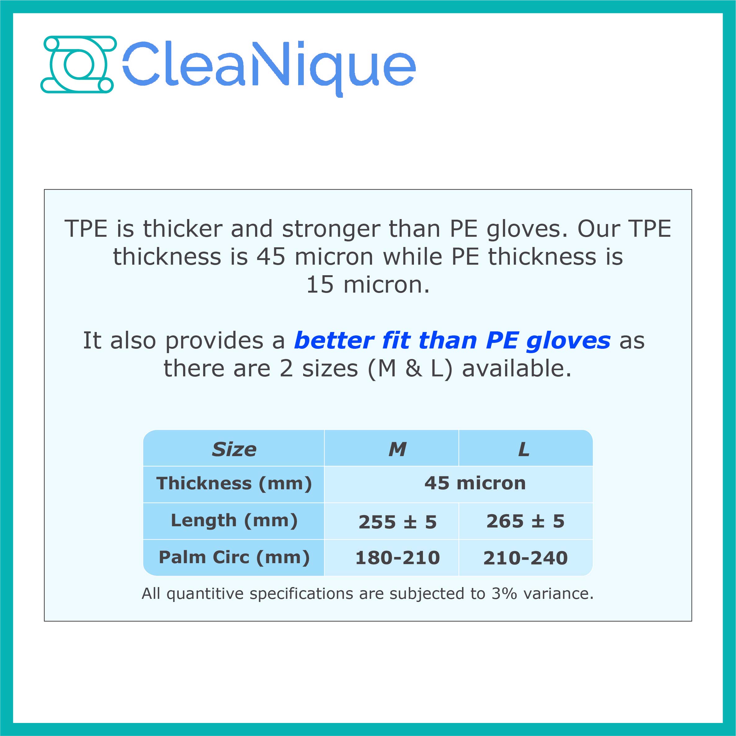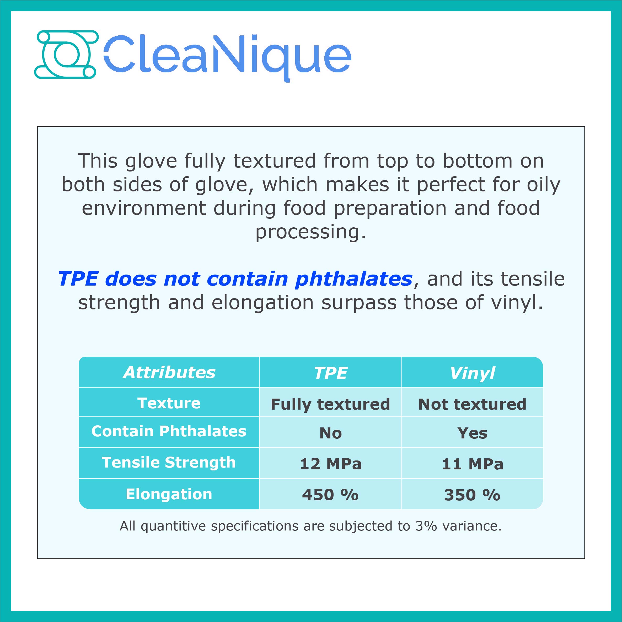 TPE gloves are made of thermoplastic elastomers, a type of plastic with high tensile strength and elongation.