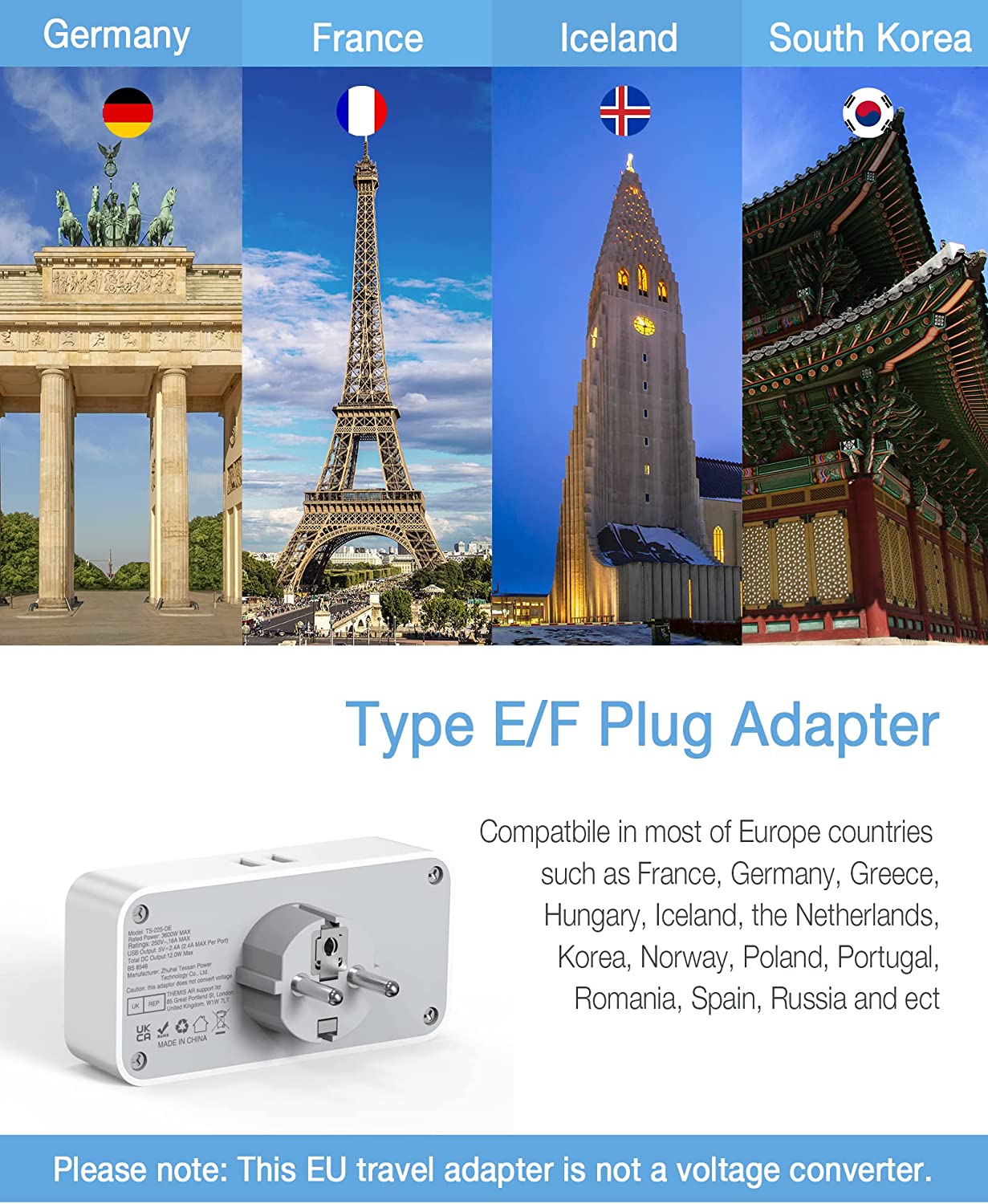 Note:This is not a voltage converter. If you want travel to a european country with a standard voltage of 110~125V, you may need a voltage converter.