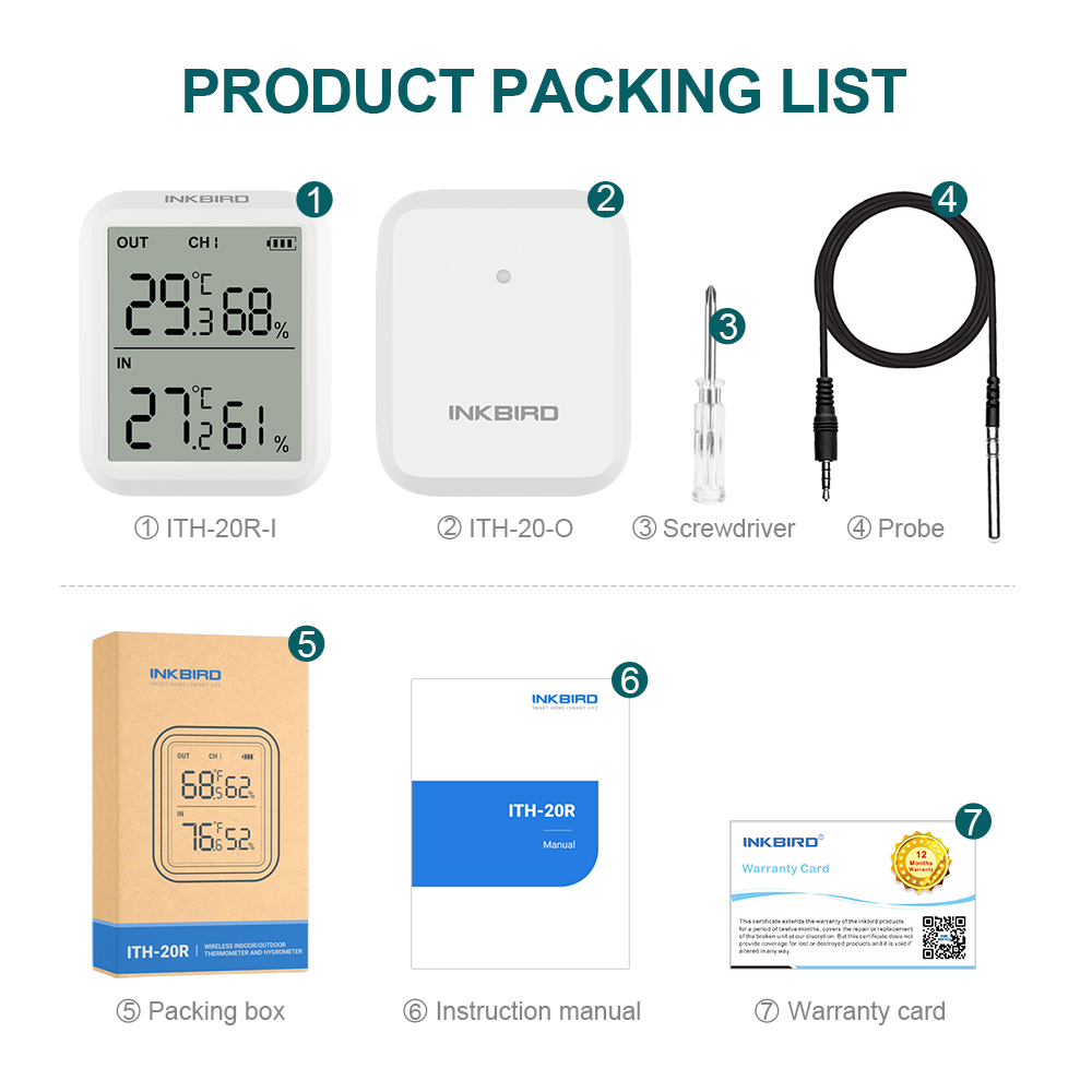 ITH-20R Weather Station and Hygrometer Large Backlight LCD Outdoor&Indoor Inkbird Unit for House Kitchen Courtyard
