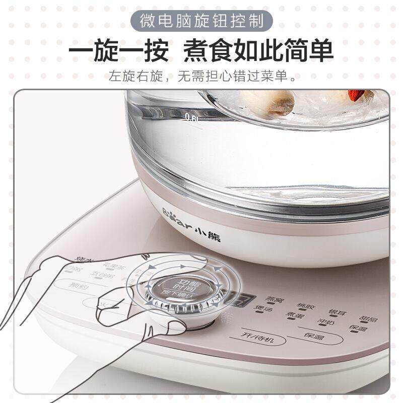Double lid gas stew tempered glass panel full circle heating anti-adhesive bottom[New listing] 1.8L stew pot, with glass strainer and stew pot, 360 degree ring heating, tempered glass panel, immersed stew pot evenly heatedBrand: BearModel: YSH-C18S2Color Category: WhiteCapacity: 1.8LBody material: borosilicate glassFunction: insulation, appointment, timingFilter: YesHeating method360 degree base supportAutomatic power off anti-dry burnout deviceApplicable number of 2-4 peopleRated voltage v220vRated frequency hz50hzRated power w1000W