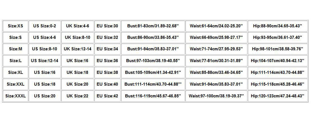 | Size:XXL | US Size:18 | UK Size:20 | EU Size:40 | Bust:111-114cm/43.70-44.88''' | Waist:91-94cm/35.83-37.01'' | Hip:115-118cm/45.28-46.46'' |